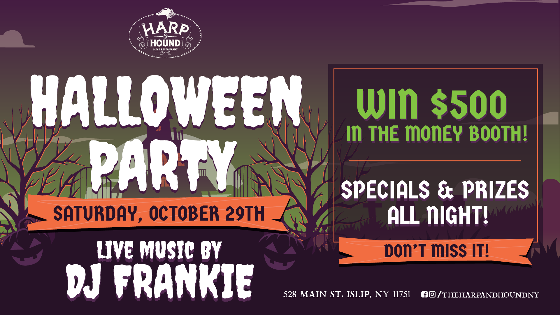 Halloween Party Saturday, October 29, 2022 7:00 PM 11:55 PM Google Calendar ICS Things are getting spooky at The Harp & Hound! Party with us on Saturday, October 29th in your Halloween best -We'll have DJ Frankie spinnin' live, specials & prizes all night, and a chance to win up to $500 in the money booth!