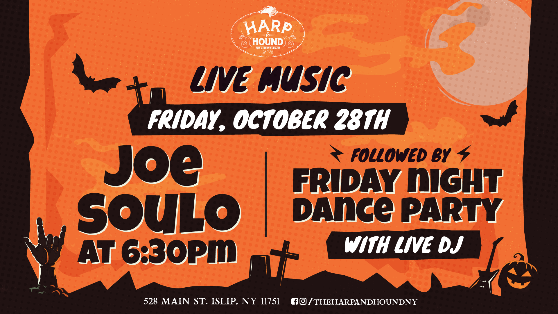 Back to All Events Live Music with Joe Soulo Friday, October 28, 2022 6:30 PM 9:30 PM Google Calendar ICS There’s nothing spooky about Joe Soulo other than his insane music! Kick off your Halloween weekend with Joe Soulo! Join us on October 28th at 6:30 pm!