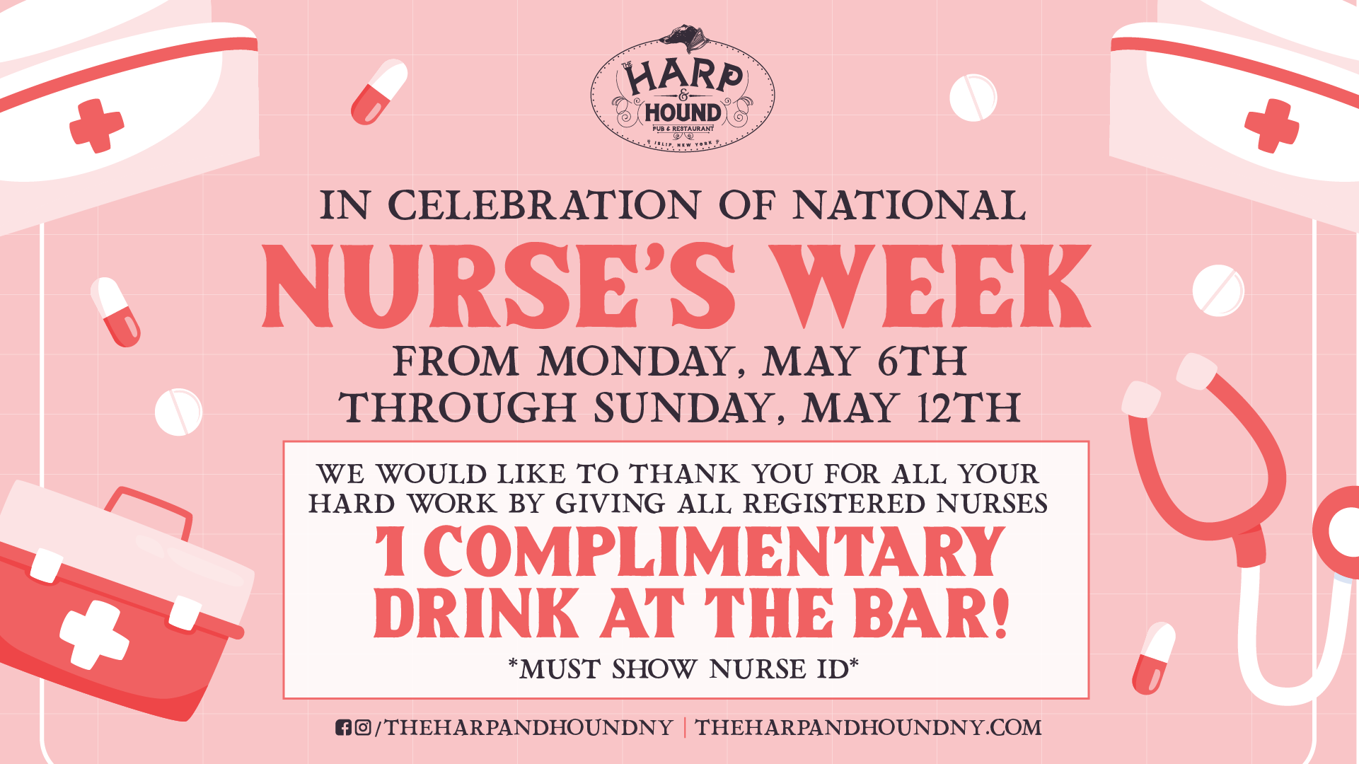 Back to All Events Nurse's Week Monday, May 6, 2024 12:00 PM Sunday, May 12, 2024 11:55 PM Google Calendar ICS Are you a nurse? Celebrate Nurse's Week with a complimentary drink from the Harp & Hound! Enjoy this special deal from Monday, May 6th to Sunday, May 12th.