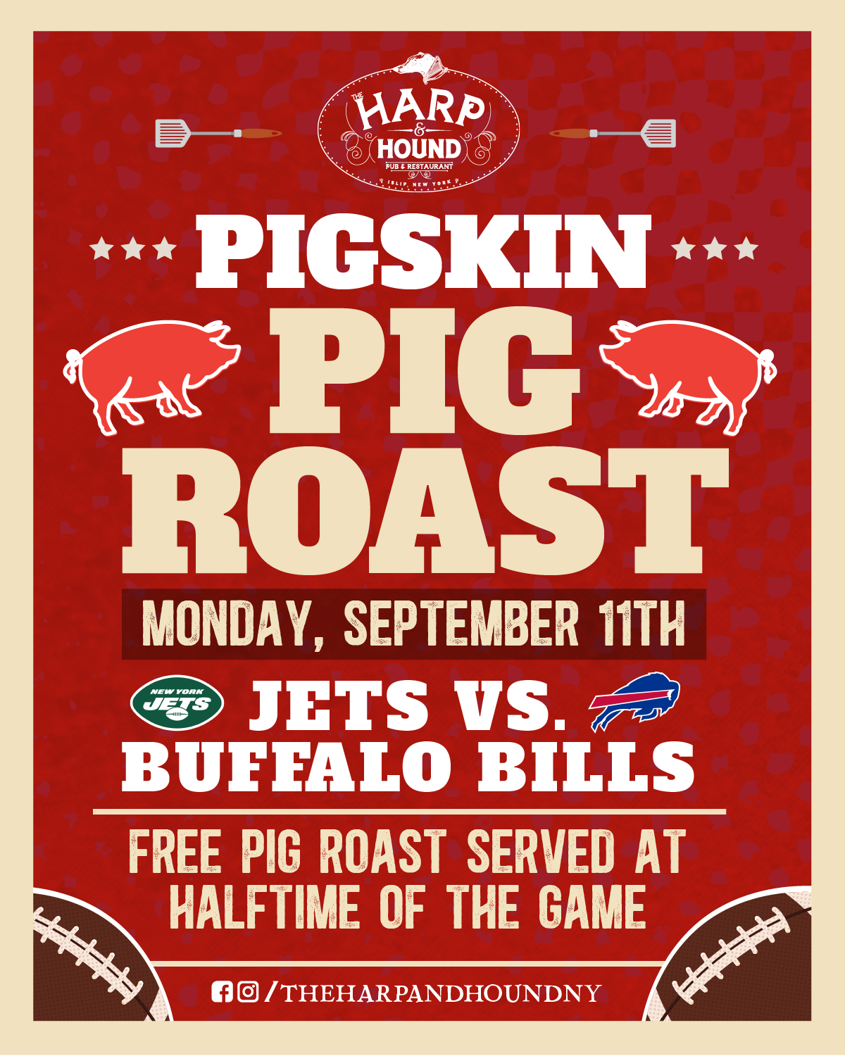 Hang out with us for a pigskin pig roast on September 11th! Free pig roast will be served during halftime of the Jets vs Buffalo Bills game!